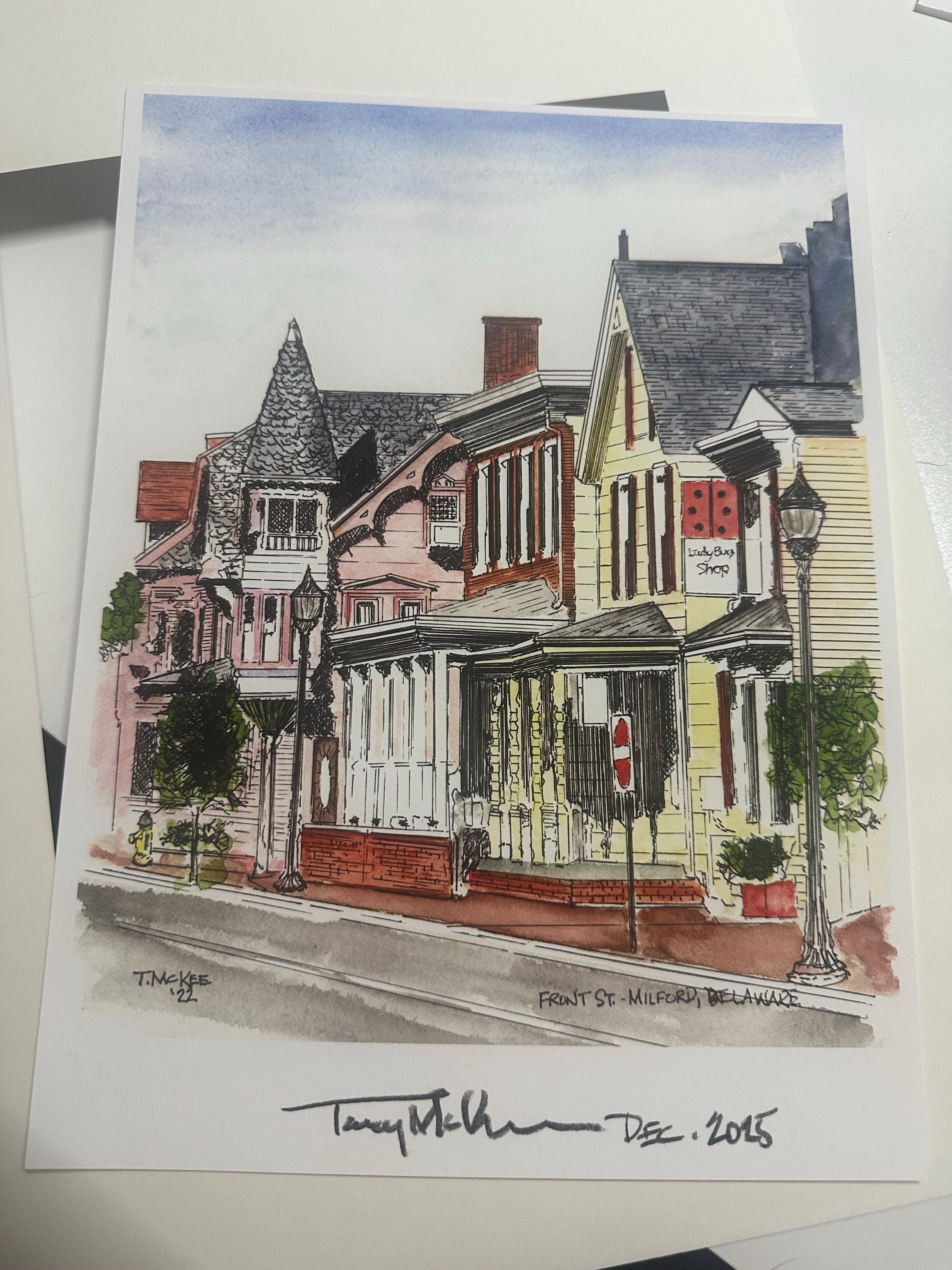 This is a print reproduction from my watercolor painting of a view down Front Street in Milford, Delaware. My in-laws were Milford residents for several years, and we have many fond memories of the town and surrounding landmarks. The view also includes a famous landmark in the background, known as "The Towers", a beautiful pink Victorian home which was built in the late 1700's. In 1887, the owner made extensive renovations to convert the structure into a Victorian style mansion. Today, this historic house serves as a bed and breakfast.
