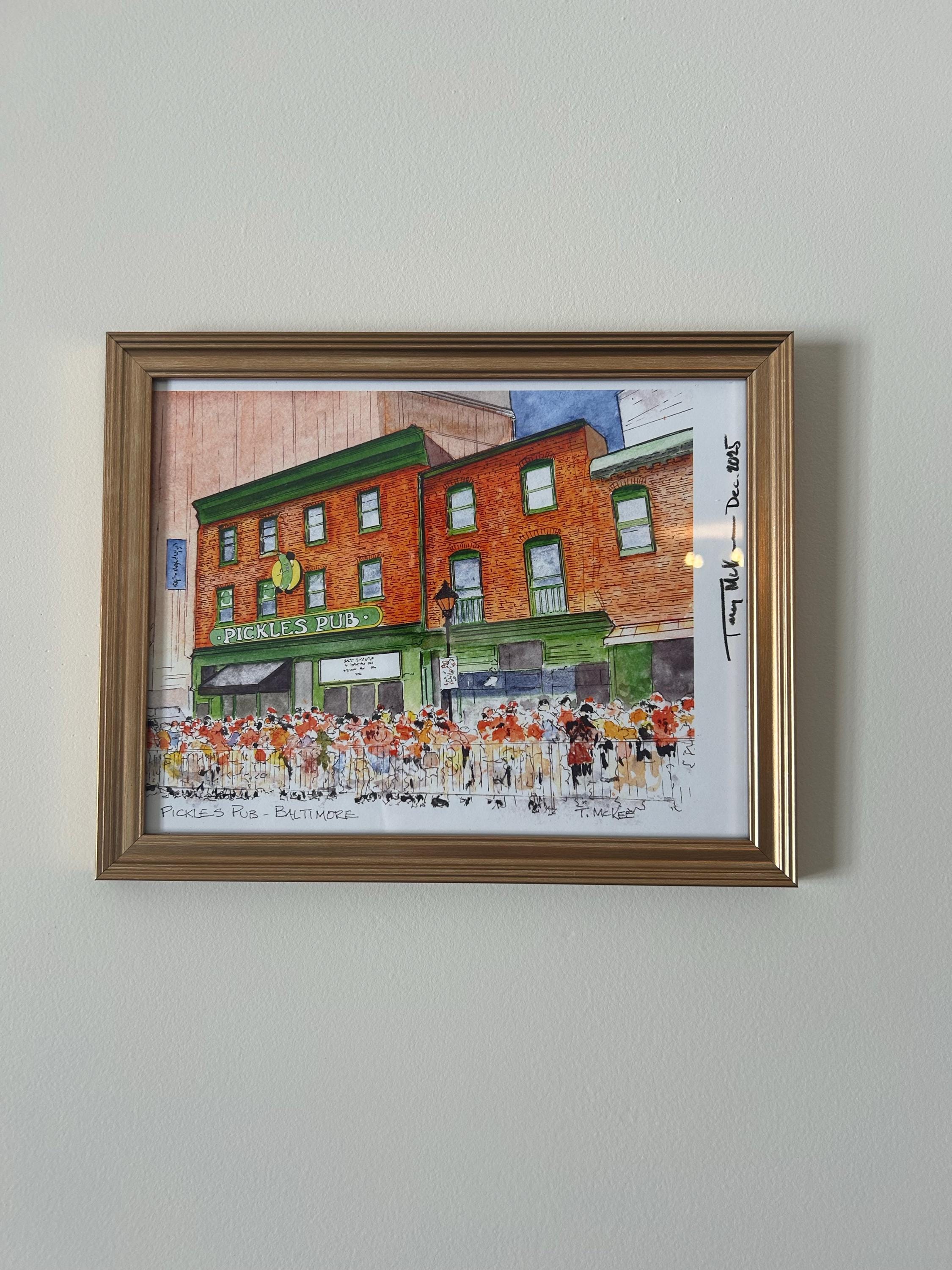 This is a colorful fine art print reproduction from my original watercolor painting of the famous "Pickles Pub", a sports bar located just outside Orioles Park at Camden Yards in Baltimore, commonly surrounded by fiercely loyal Orioles fans. Pickles has been around since 1988, and is a great stop before or after the game, but be careful not to get tied up inside too long and miss the ball game!